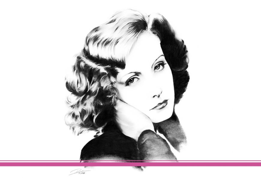 Minimale Portrait-Zeichnung der Schauspielerin und Ikone Greta Garbo. Die Zeichnung ist Teil der “Hollywood Diven” Serie, genauso wie Romy Schneider, Marilyn Monroe und andere.