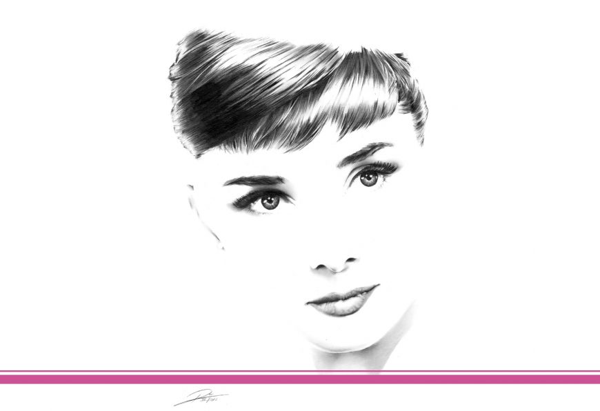 Minimale Portrait-Zeichnung der Schauspielerin Audrey Hepburn. Die Zeichnung ist Teil der “Hollywood Diven” Serie, genauso wie Greta Garbo, Marilyn Monroe und andere.