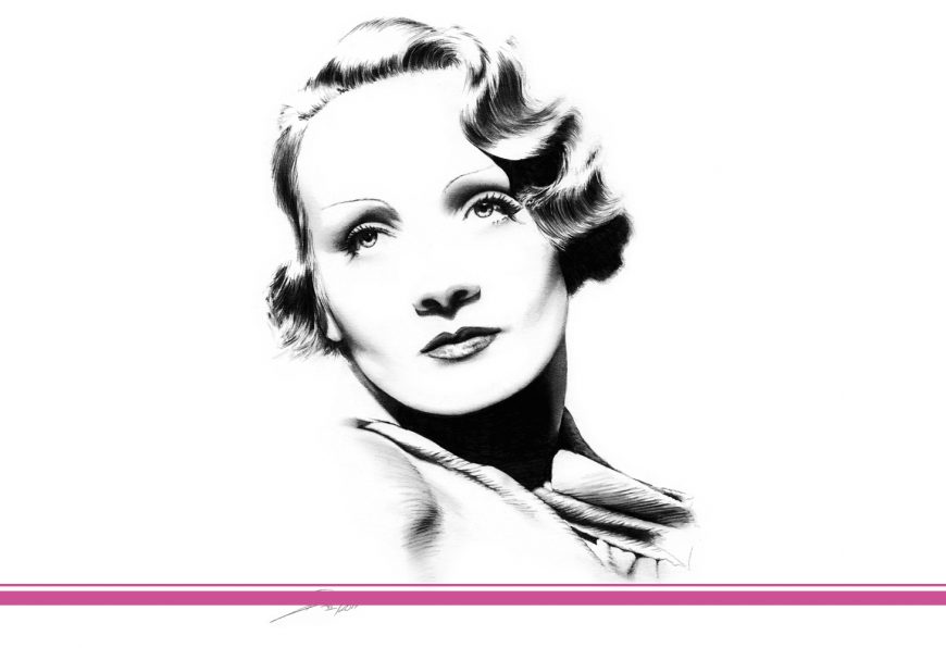 Minimale Portrait-Zeichnung der Schauspielerin Marlene Dietrich. Die Zeichnung ist Teil der “Hollywood Diven” Serie, genauso wie Greta Garbo, Marilyn Monroe und andere.