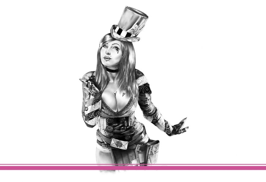 Bleistiftzeichnung auf Schöllershammer 4R – Moxxi ist auf Pandora die bekannteste Person neben Handsome Jack und betreibt Underdoms, Kampfarenen in denen Kammer-Jäger wellenbasiert gegen verschiedene Gegner kämpfen, nebenbei aber auch mehere Bars wie Moxxis Red Light.
